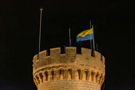 Historic round stone tower with Catalonia flag in Tossa de Mar Spain
