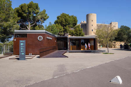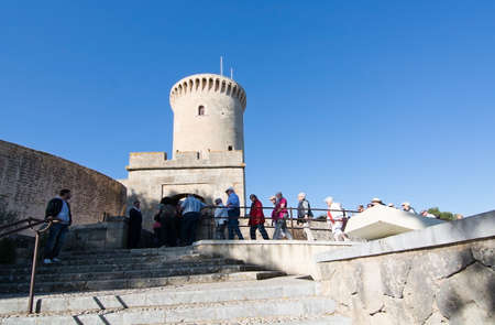PALMA DE MALLORCA, SPAIN - March 10, 2017: Bellver castle morning exterior and early tourists on March 10, 2017 in Mallorca, Spain.