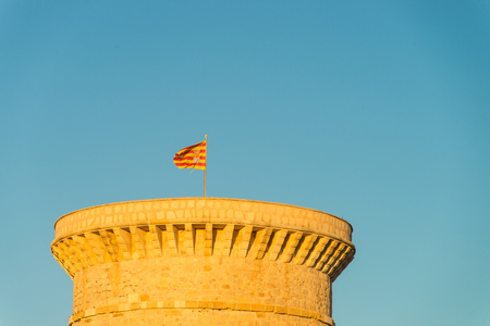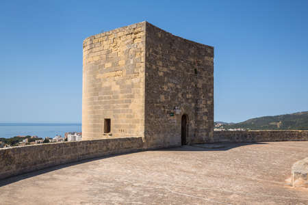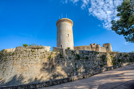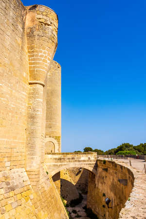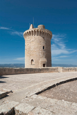 PALMA DE MALLORCA, SPAIN - MARCH 18, 2017: Bellver castle gothic tower from 12th century against blue sky on a sunny day on March 18, 2017 in Palma, Mallorca, Spain.