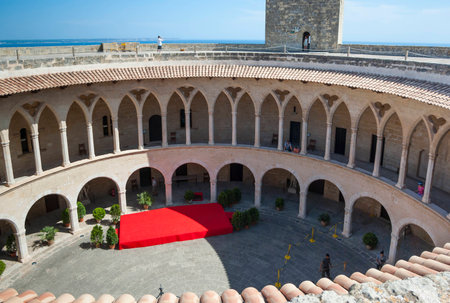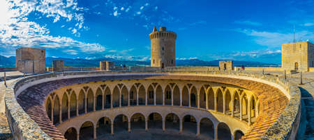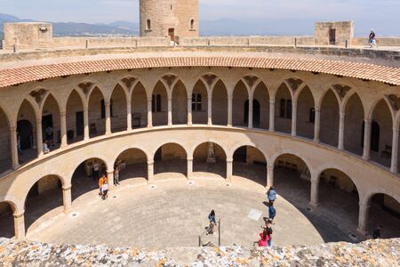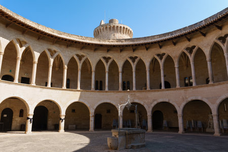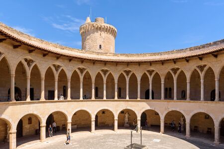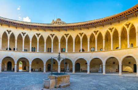 PALMA DE MALLORCA. SPAIN - SEPT 21, 2023: Inner yard of the Circular Gothic Bellver Castle (Castillo de Bellver) built by architect Pere Salvà in 1300-1311 for King James II of Aragon and Majorca.