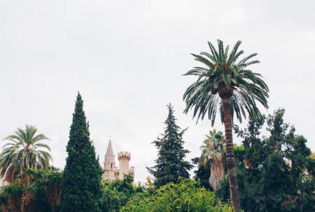Exotic tree, palm trees against the background of the ancient tower, Palma de Mallorca, Spain. Facade of an ancient building.
