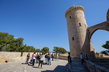 Castell de Bellver, Palma de Mallorca, group of tourists stands in front of an ancient stone castle with a prominent round tower under a clear blue sky, Majorca