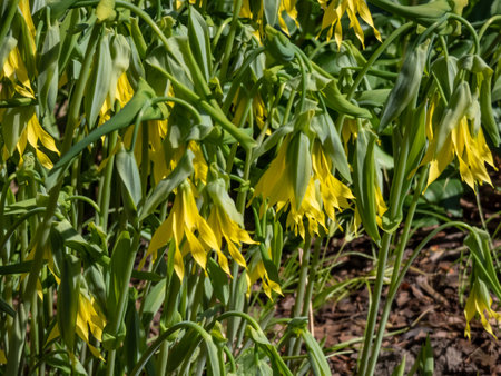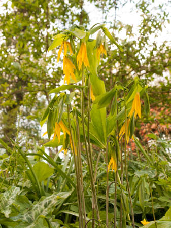 Close-up of the perfoliate bellwort (Uvularia perfoliata) growing in the garden and producing pale yellow flowers with long tepals