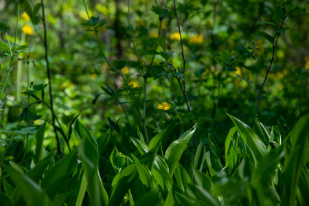 Forest glade with lilies of the valley and celandine green background bokeh.