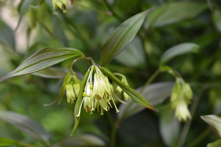 Disporum sessil (Japanese fairy bells) flowers. Colchicaceae perennial toxic plants. Thin, tubular flowers hang down from spring to early summer.