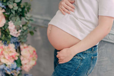 belly of a pregnant woman on a light natural background in jeans