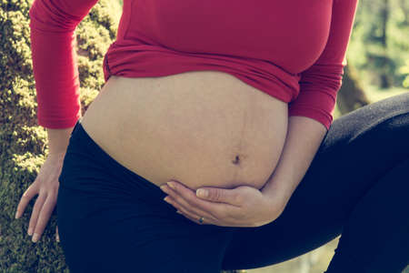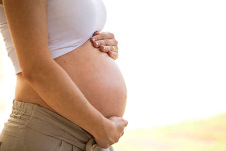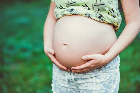 Close-up of pregnant belly outdoors copyspace. Pregnancy and motherhood concept.