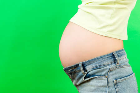 Close up of pregnant woman in opened jeans caressing her baby bump at colorful background with copy space. Waiting for a baby concept.