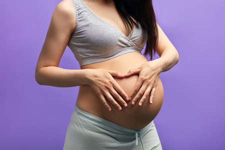 Studio portrait of pregnant caucasian woman with long dark hair. Happy future Mom posing with hands formed heart sign on naked belly over purple background