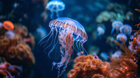 This stunning image showcases jellyfish swimming gracefully in dark ocean waters, highlighting their delicate beauty and fascinating movement in a tranquil marine setting.