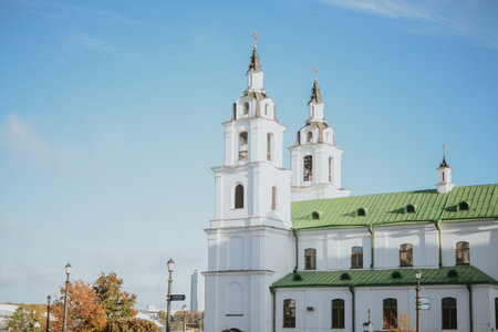 Holy Spirit Cathedral in the Upper Town of Minsk on a sunny autumn day. White church with a green roof and a cross against a blue sky. High quality photo