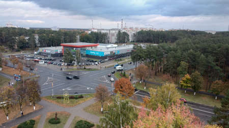 Cityscape of Gomel, Belarus. Aerial view of town architecture. City streets at sunset, bird eye view
