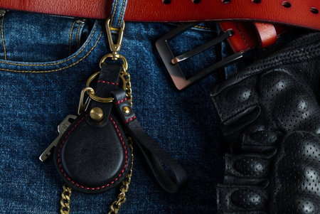 Red leather belt and blue jeans close-up.