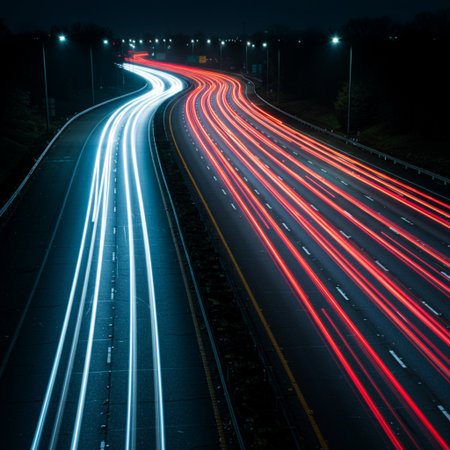 An AI generated illustration of light trails created by multiple vehicles travelling along a road at night