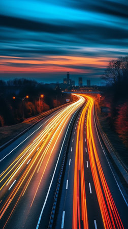 A scenic view of a bustling highway at night, with streams of car lights creating vibrant trails against the dark backdrop of a city skyline, showcasing urban transportation