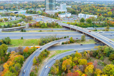 An aerial view of a complex highway interchange, with multiple lanes and ramps visible, showing the flow of traffic and the intricate road network.