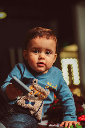 Toddler baby boy takes a selfie photo on a mobile phone in his hand