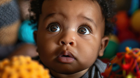 Curious baby with big, expressive eyes gazes upward, surrounded by colorful toys. scene captures moment of wonder and exploration, highlighting joy of early childhood