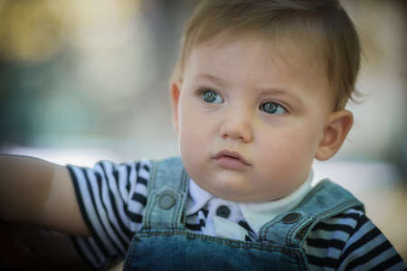 Kid's concept, emotions.Cute little boy staying in park and pensively looking at camera
