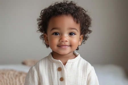 Joyful baby with curly hair smiles brightly, illuminated by soft light, creating warm and tender atmosphere. expression captures innocence and happiness, evoking feelings of love and joy