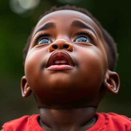 Cute baby looks up at the sky with innocent eyes