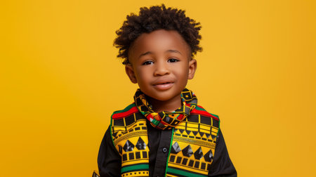 Portrait of joyful african child in traditional attire with a gentle smile and space for text