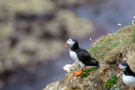 Portrait of Atlantic puffin in natural habitat, Fratercula arctica. One bird sitting on cliff with blooming chamomiles in Latrabjarg, Iceland.