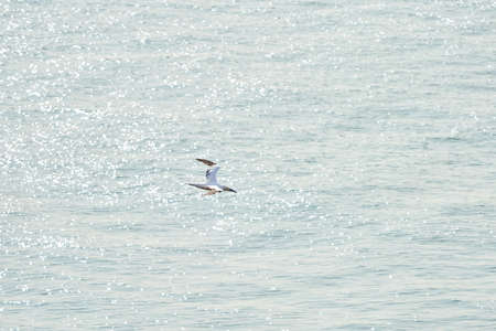 Seagull flying over sparkling blue ocean waves on a sunny day.