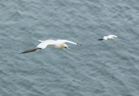 Gannets, Morus bassanus, in flight at Bempton Cliffs in Yorkshire