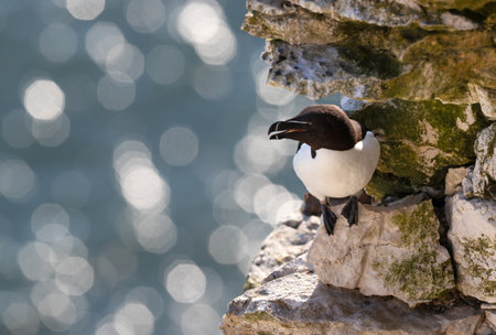 A Razorbill bird (Alca torda) with distinctive black and white plumage and a blunt, white-striped bill perches on a sunlit rock against natural bokeh background, UK.