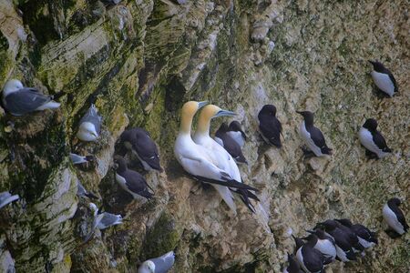 Gannets, morus bassanus, and Kittiwakes, rissa tridactyla, perched on cliff nests