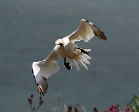 Gannet (Morus bassanus) is ready to land on a cliff on the island or helgoland in germany.