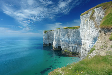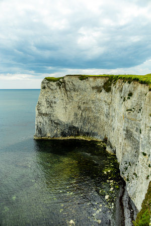 Old Harry Rocks chalk formations, view at Handfast Point, on the Isle of Purbeck, Dorset, southern England. Huge wall of white chalk cliffs