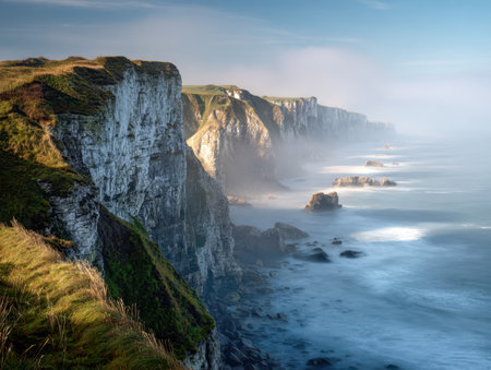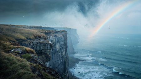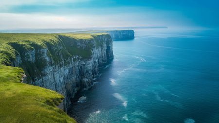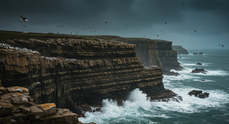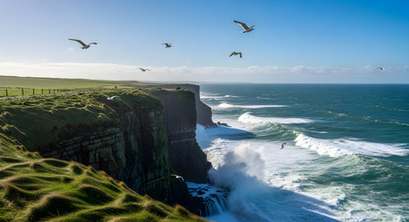Breathtaking cliffs of moher, ireland. Crashing waves meet dramatic cliffs, with seagulls soaring in the sky. A truly scenic landscape.