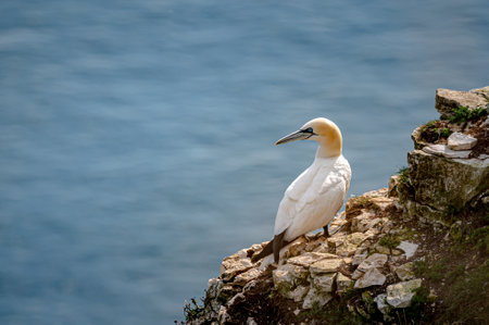 Northern gannet, morus bassanus, perched on cliff rocks