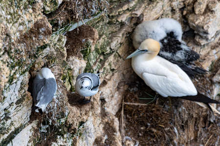 Gannets, morus bassanus, and Kittiwakes, rissa tridactyla, perched on cliff nests