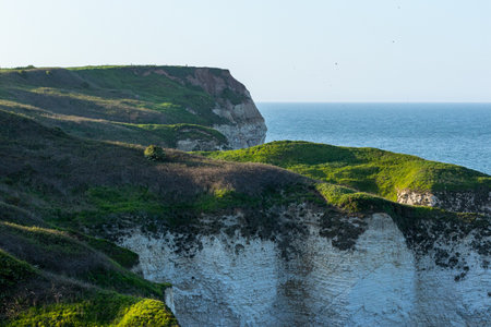 Flamborough coastline of England, Great Britain. North Sea off East Riding of Yorkshire. Flamborough Cliffs, North Landing. Travel and Tourism in the UK.