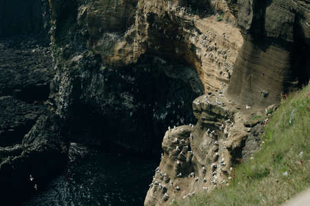 Nesting Kittywakes and Razorbills and other seabirds on a cliff in coastal Northern UK