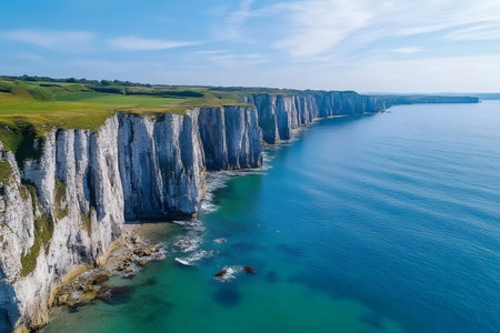 A stunning aerial view of a cliff by the ocean, where the fluid water meets the natural landscape, creating a picturesque and tranquil scene under the open sky AIG50