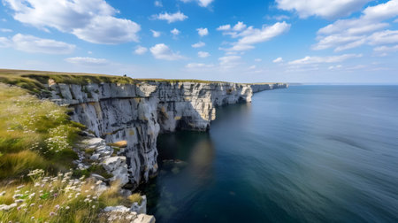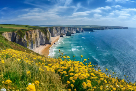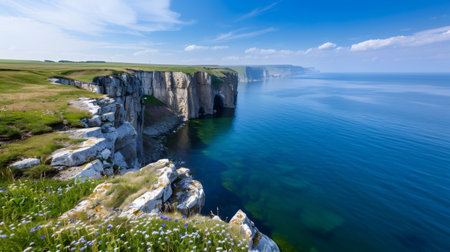 Experience a serene coastal view showcasing dramatic cliffs and blooming wildflowers by the ocean, perfect for nature lovers and travel enthusiasts.