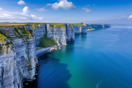 calm view from cliff on beautiful blue sea, Etretat, Normandy, France