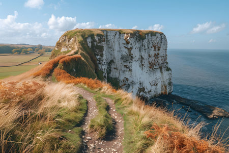 A breathtaking coastal cliff pathway stretches towards a majestic white cliff overlooking the serene ocean. the path is adorned with autumn foliage, capturing the essence of nature in full bloom and offering a picturesque view perfect for travel and nature photography. Generative AI