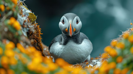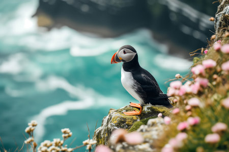 Portrait of Atlantic puffin in natural habitat, Fratercula arctica. One bird sitting on cliff with blooming chamomiles in Latrabjarg, Iceland.