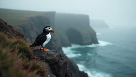 Puffin on rocky cliffside observes foggy coastal scenery