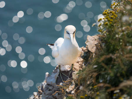 A Gannet (morus bassanus) sits on a rock ledge covered in wild flowers with a sparkling sea below