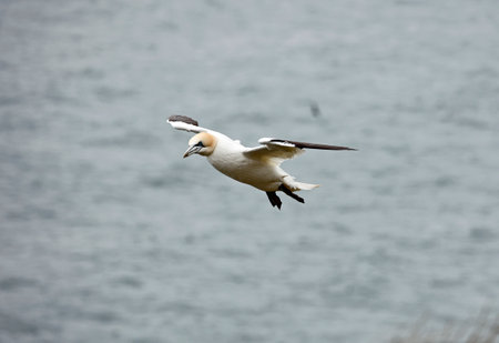 Northern Gannet flying by the cliffs of Bempton Cliffs, Flamborough Head, East Yorkshire, UK