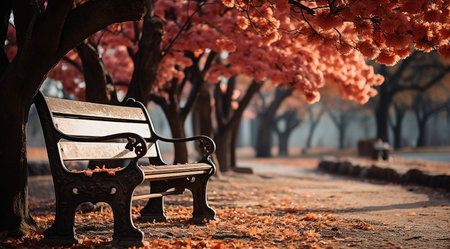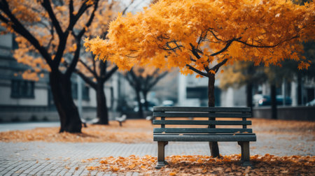 A tree with orange leaves and a bench in the background. Generative AI.