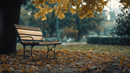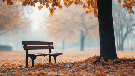 A quiet park features a lone bench under a tree with vibrant autumn leaves. Soft light casts a peaceful atmosphere, inviting reflection.