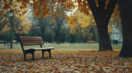 A tranquil park bench sits amidst a carpet of colorful autumn leaves, inviting reflection and relaxation in a serene natural environment.
