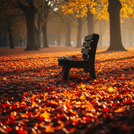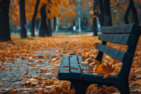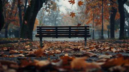 A picturesque autumn scene featuring a solitary park bench surrounded by vibrant, falling leaves, creating a peaceful atmosphere for relaxation and reflection.